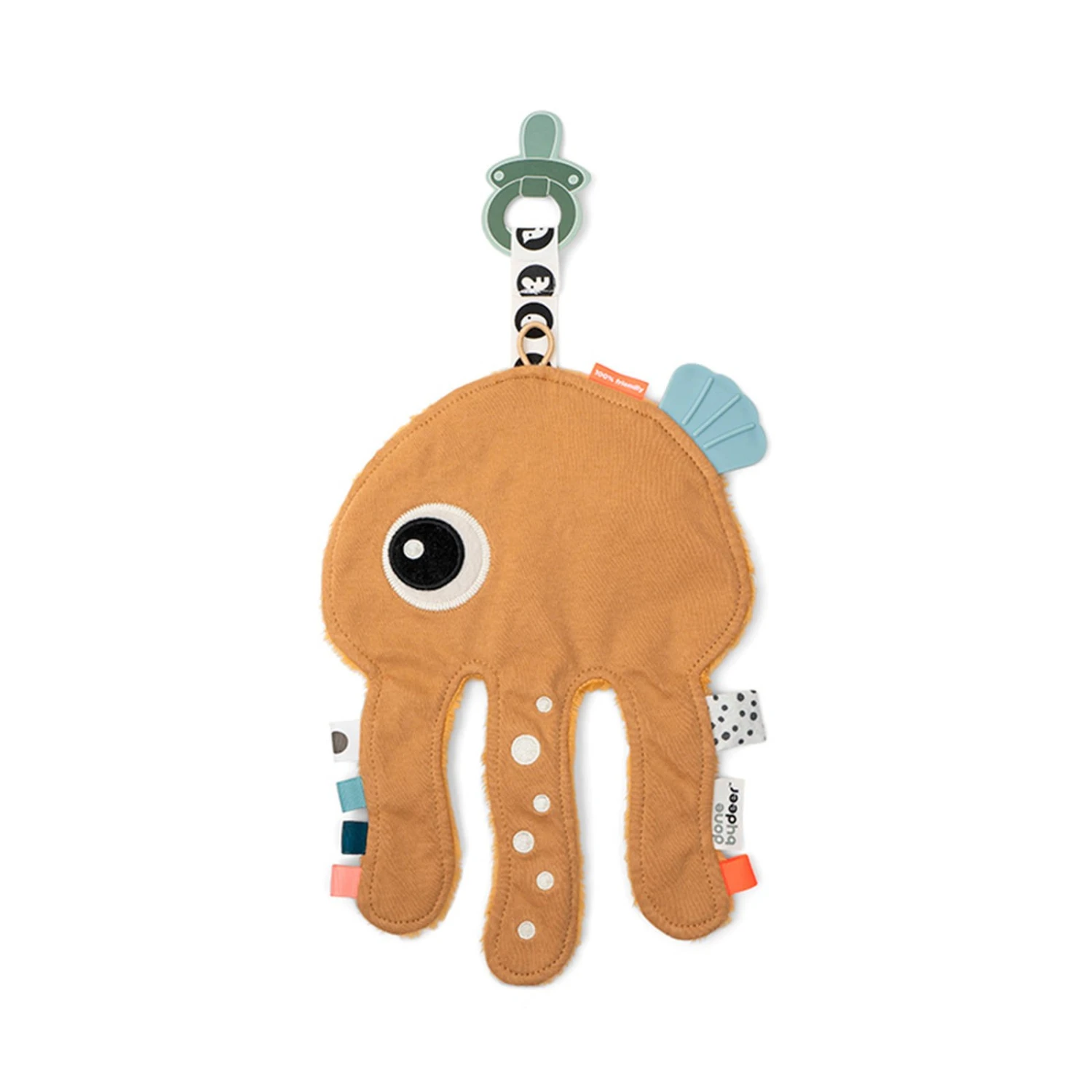 Deze kleine octopus wordt vast en zeker je kleintje zijn of haar beste vriend. De zachte siliconen bijtring stimuleert en verzacht jeukende tandvlees. De schattige kwal houdt fopspenen bij de hand als het bedtijd is of als je onderweg bent. Door de praktische klittenbandsluiting en elastische lus kunnen zowel fopspenen met als zonder handvatten worden bevestigd. De troostende Zeevriend is een perfecte metgezel voor je baby. Het zachte comfortdeken in warme mosterdtinten geeft je kleintje een zintuiglijke ervaring.